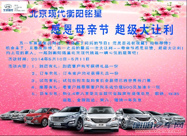 衡阳汽车网讯:五一车展黄金周刚过,又迎来了妈妈们的节日!您是否还在观望?还在等待?还再期盼?机会来了,且看且珍惜,五一之后的最后一次大让利——母亲节【5月10日-11日】衡阳铭星北京现代感恩回馈,超级大让利!约上您的家人,一起到衡阳铭星北京现代挑选一辆心仪的座驾吧!
